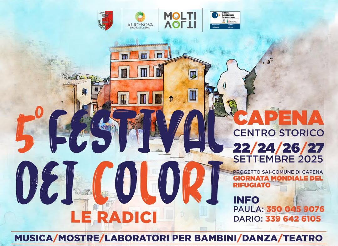 Dal 22 al 27 settembre 2025 Capena (RM) si accende con la quinta edizione del Festival dei Colori, un evento diffuso e partecipato in occasione della Giornata Mondiale del Rifugiato, a cura del progetto SAI (Sistema Accoglienza Integrazione) del Comune di Capena gestito dalla Cooperativa Sociale Alicenova. Per l’occasione il centro storico si anima con musica, danza, teatro, mostre e laboratori per bambini e adulti, tutti a partecipazione gratuita. Una settimana di appuntamenti promossi da Alicenova che raccontano l’identità del territorio, intrecciando radici, memoria e multiculturalità, grazie alla collaborazione di numerose realtà locali e al coinvolgimento attivo dei beneficiari del locale progetto SAI.