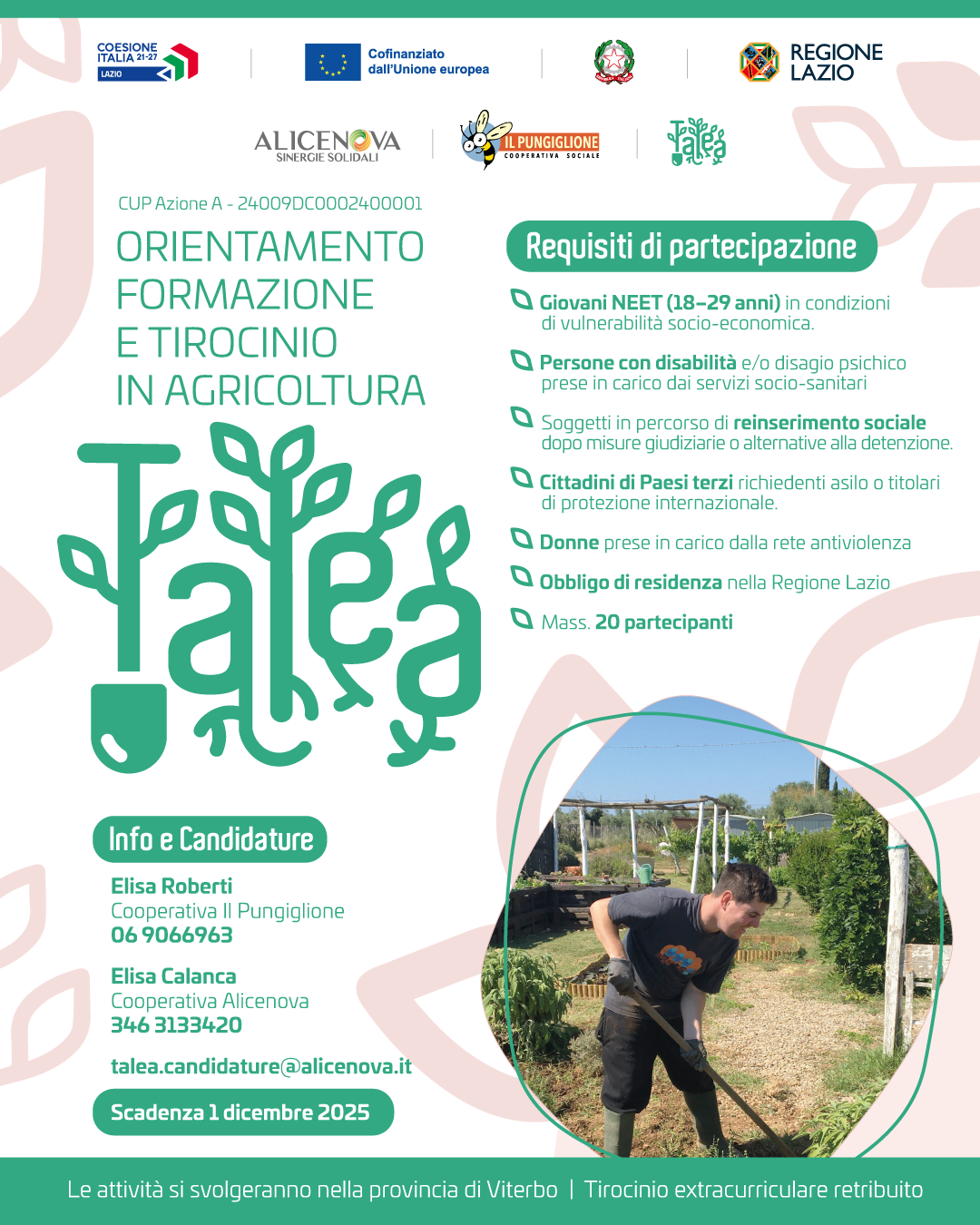 Talea è un’iniziativa pensata per offrire nuove opportunità nel mondo dell’inclusione lavorativa e dell’agricoltura. Un progetto che nasce dall’esperienza e dalla collaborazione tra la Cooperativa Alicenova e la Cooperativa Il Pungiglione, con il sostegno della Regione Lazio e il cofinanziamento dell’Unione Europea.